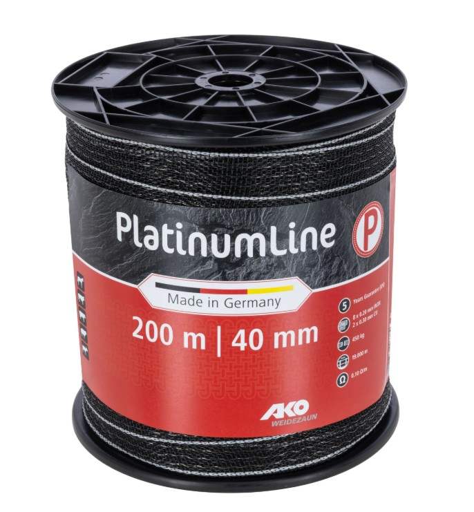 Ruban clôture électrique PlatinumLine 40 mm 200 m noir/blanc – 0,1 Ω/m – 8 inox Ø0,2 + 2 cuivre Ø0,3 – rupture 450 kg – clôture jusqu’à 19 km